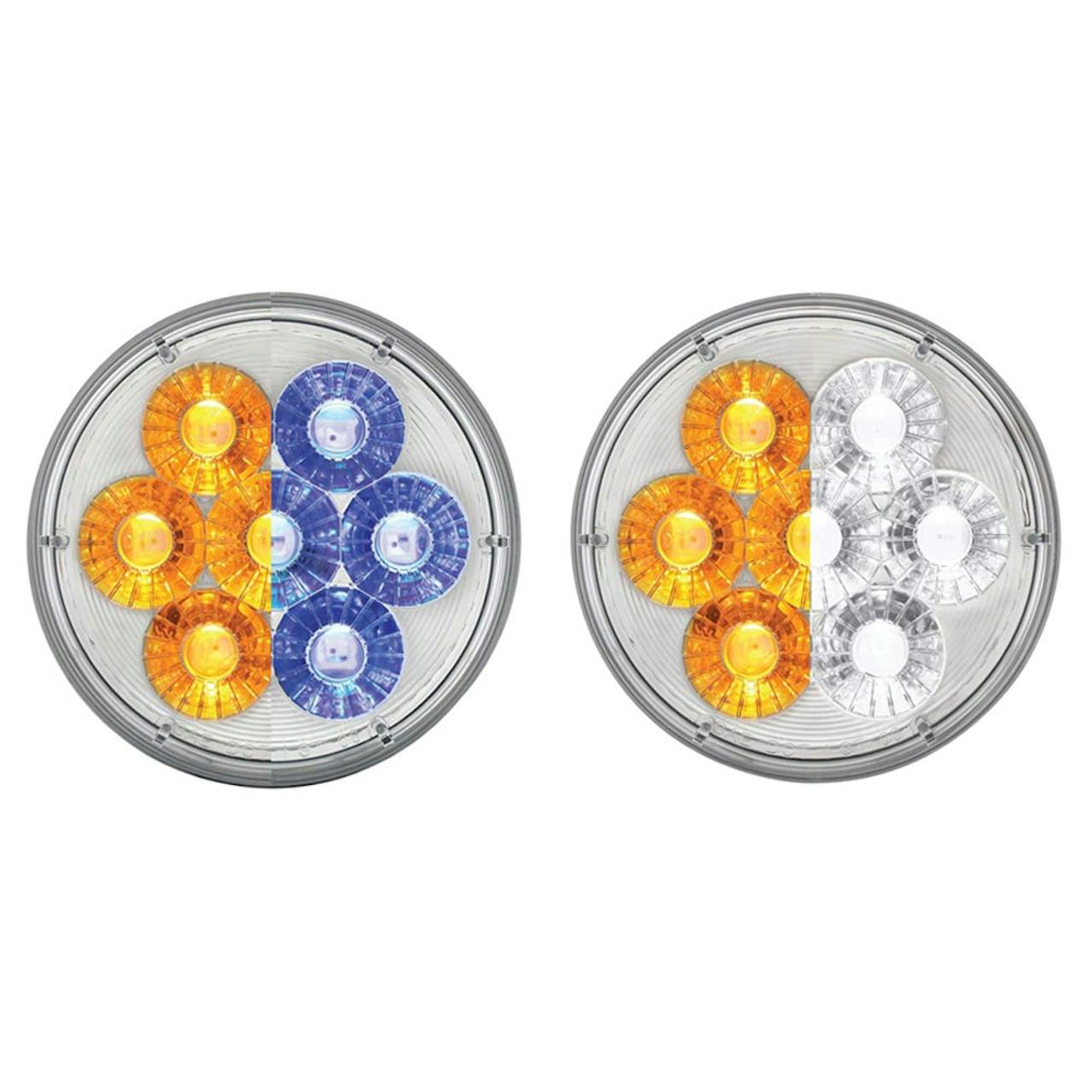 The Double Fury 14 LED 4" clearance marker light features a dual-color design with 14 bright LEDs, available in amber and blue, and amber and white. Its clear polycarbonate lens is sealed with resin to prevent moisture intrusion, and the electronics are epoxy-sealed for extra protection against corrosion. This 12V light uses a standard 3-pin electrical connector and mounts with a 4" rubber push-in grommet for easy installation. The primary color meets DOT/SAE FMVSS 108 standards, while the secondary color is designed for auxiliary or off-road use. IP67 water-resistant and sold individually.