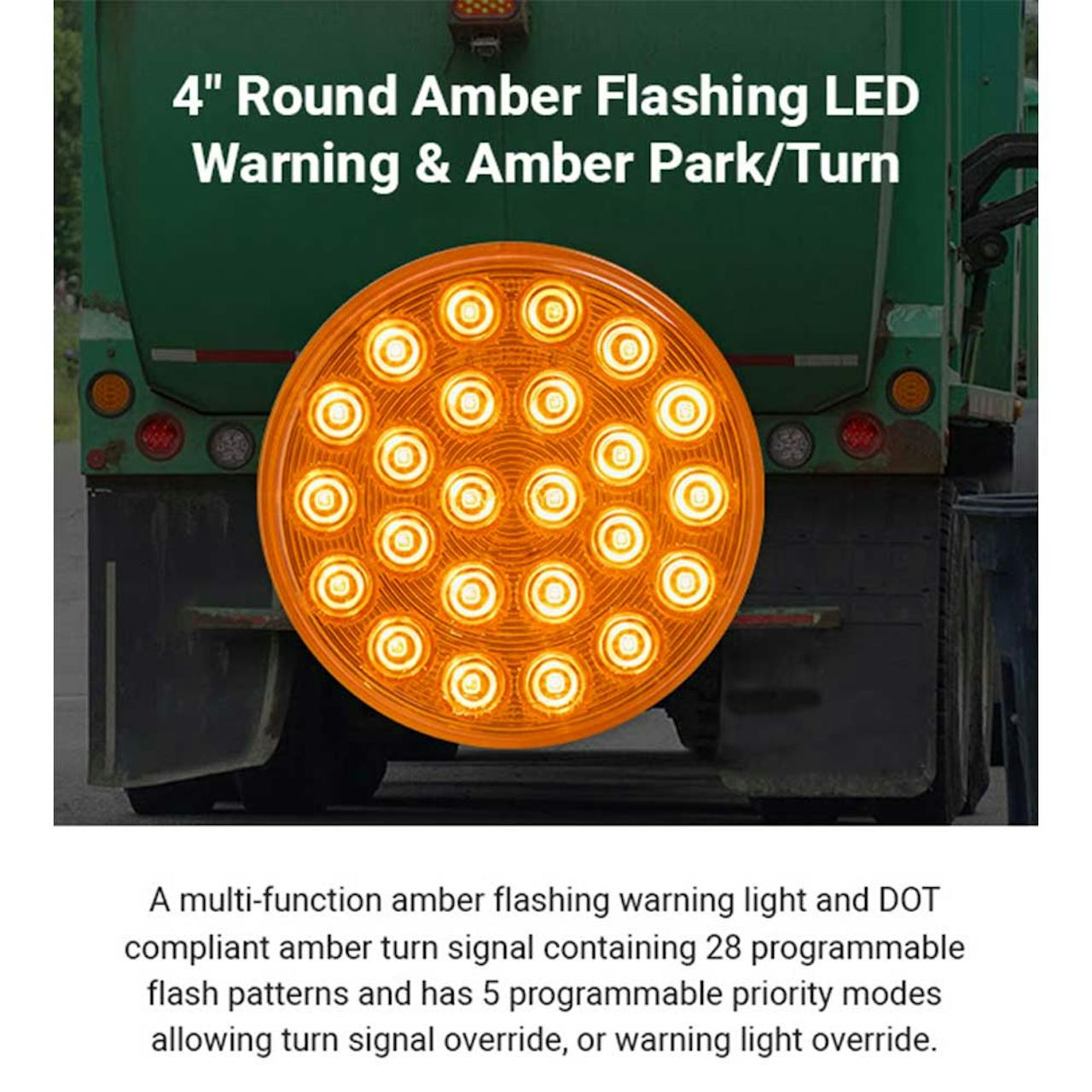 This 4” round amber LED light packs 24 high-intensity LEDs, 28 flash patterns, 5 priority modes, and multi-function capability into a compact, weatherproof design with a durable polycarbonate lens.