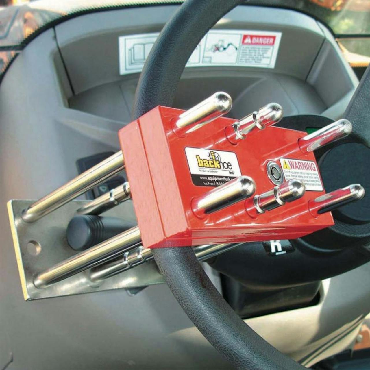 Secure your backhoe with this Backhoe Lock! This lock secures the forward/reverse drive control and steering wheel in the turned position, leaving the equipment inoperable. It is perfect for backhoe security, but can also be used for forklifts, articulating loaders, rollers, agricultural tractors, boats and more!