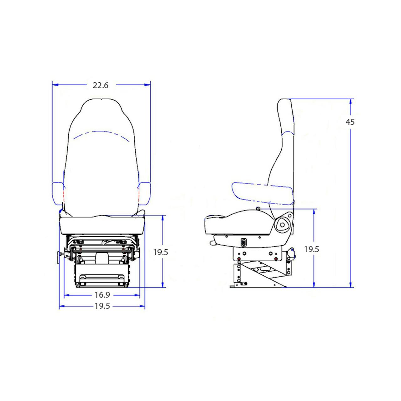 The Talladega T-915 high back seat has an ergonomic 20" wide seat upper with a 9.5" fore-aft track adjustment. It has a 6" ride zone air suspension with a dual chamber air lumbar support adjustment. The Talladega T-915 seat recline adjustment is set to 21°, which can be adjusted to a different stop position. The seat comes with a flex support cushion system and 15" long adjustable armrests. It features four position front cushion tilt adjustment and a fixed bolster support in back and cushion. It has scissor action suspension with horizontal isolation that gives you a stable driving platform.