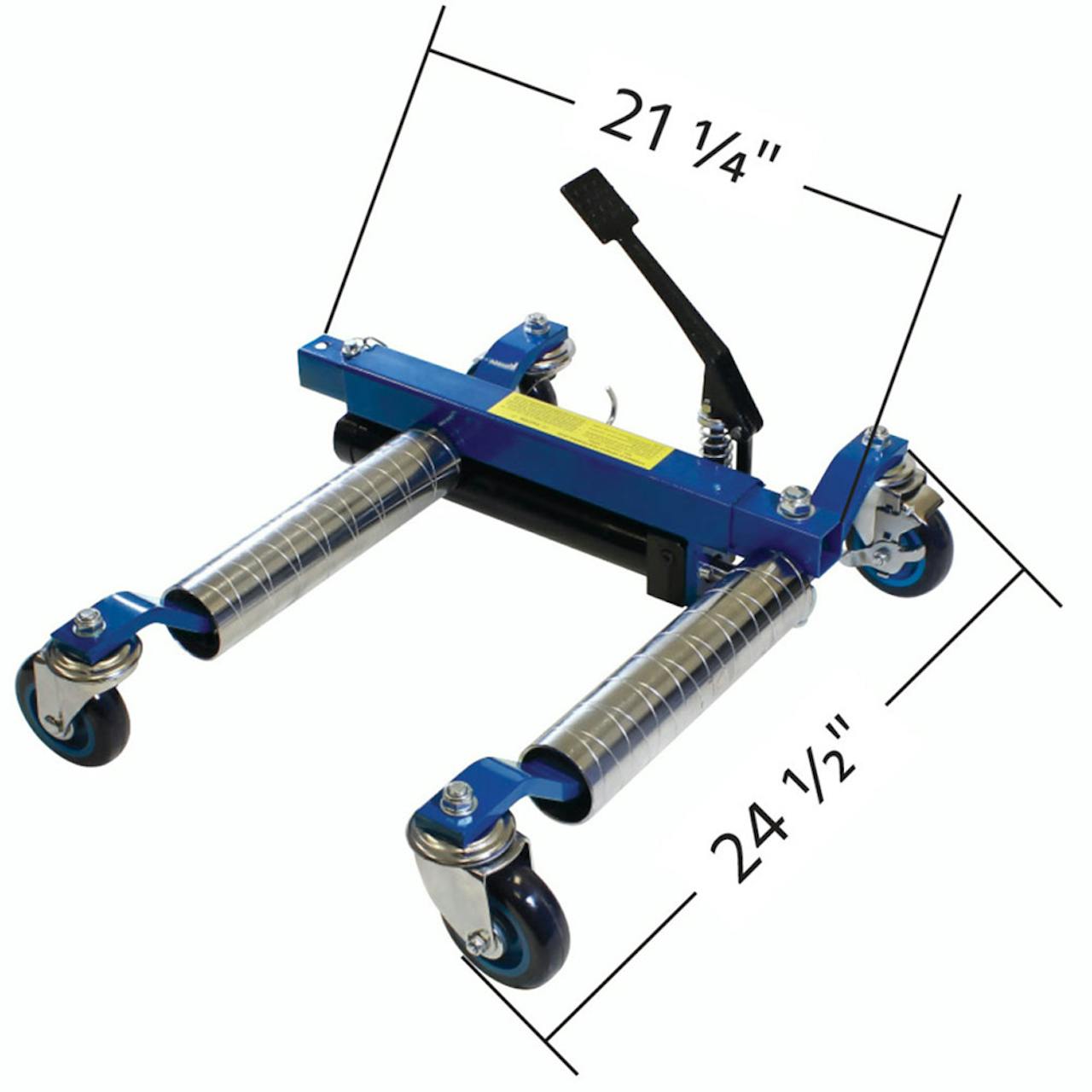 Built for tight spaces, this vehicle positioning jack features a hydraulic pump for smooth lifting, a heavy-duty steel frame with tire rollers, and durable polyurethane casters that protect your floor—two with toe locks for added safety. With a 1500 lb. capacity, it's the perfect tool for lifting vehicles effortlessly and securely.