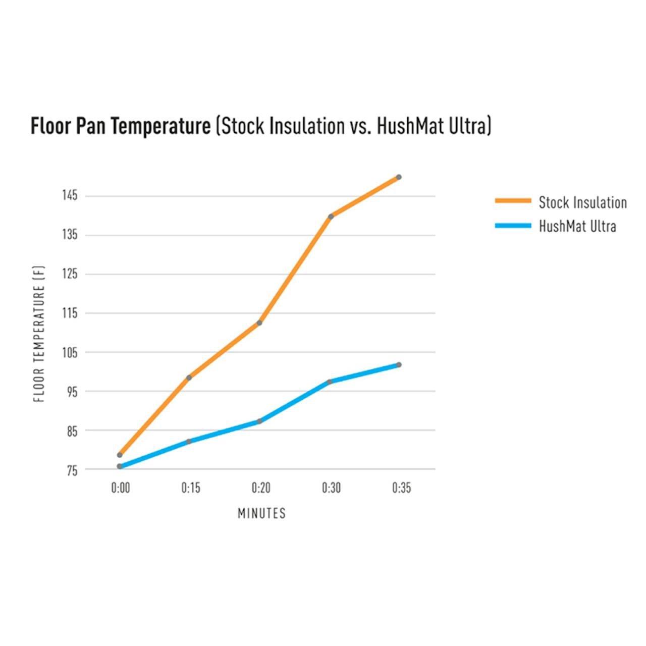 The Hushmat also acts as thermal insulation, reducing thermal transfer into your truck's interior from your engine, exhaust, and sunlight. When your truck is running, it can generate over 200°F of heat that cooks your firewall and floor pan. That means your engine, headers, manifold, & exhaust produce a tremendous amount of heat that transfers through the firewall and floor pan. This heat also causes your A/C to work harder to maintain cool temperatures inside your sleeper. Hushmat solves this problem by using USA manufactured visco-elastic chemistry which dissipates the heat insulating your interior, allowing your AC to function more efficiently and making your truck considerably cooler. In an independent study, Hushmat was proven to lower the temperature in your sleeper by over 40%.