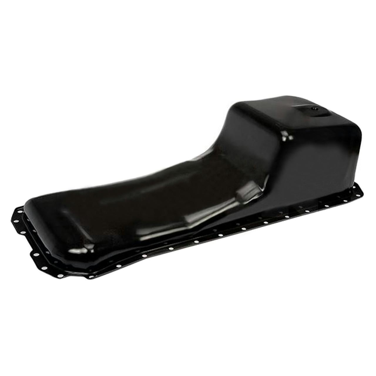 This heavy duty engine oil pan was made to match the original pan on specific vehicles. It includes the replacement pan and drain plugs to match the original components, and has a high-strength coating to prevent corrosion.