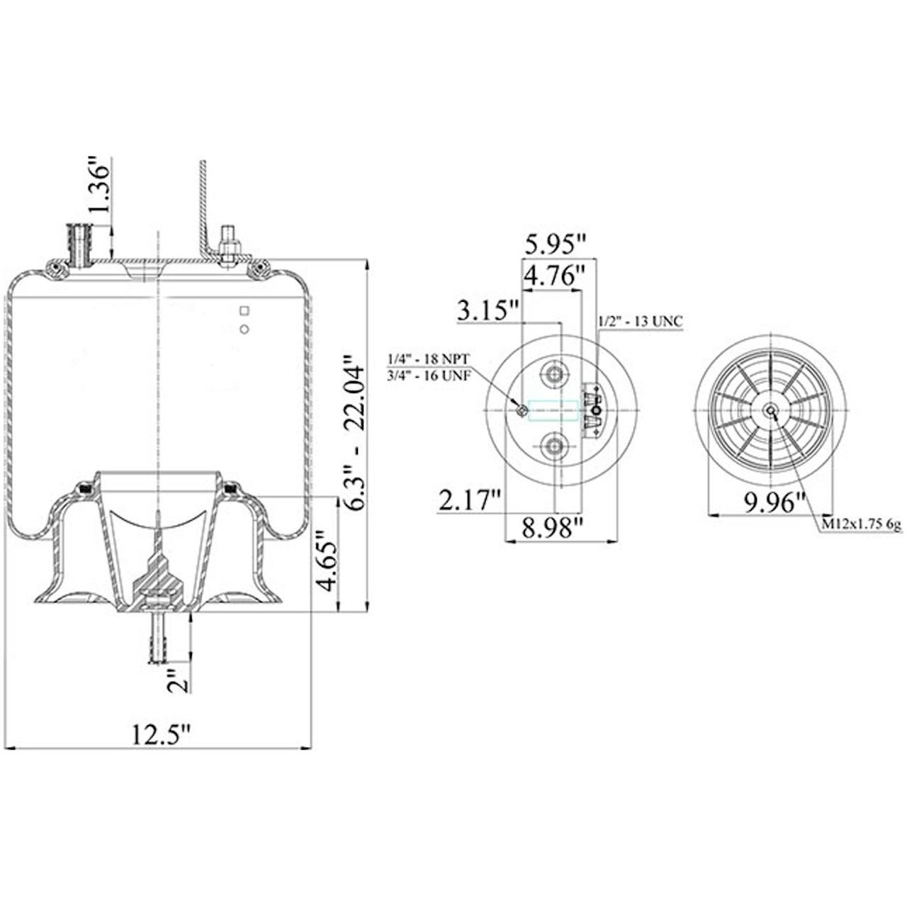 The International Rolling Lobe Air Spring 352-1190 2514461C1 W013581190 ensures optimal suspension performance and durability for heavy-duty vehicles. Featuring a 1-inch thick black rubber bellows and a robust plastic piston, this air spring delivers reliable operation in demanding conditions. Designed with a 9.96-inch bottom plate with one bolt hole and an 8.98-inch top plate with two bolt holes, it provides secure installation and compatibility with various setups. With a versatile height range from 6.3 to 22.04 inches and three mounting studs, this air spring is a dependable solution for enhancing ride comfort and suspension efficiency.