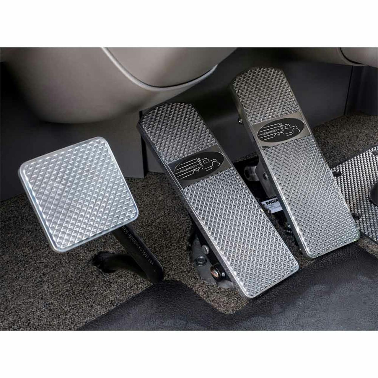The three pedal set is custom made for Peterbilt 379, 386, 388, and 389 models. It is made from diamond cut billet aluminum and includes 1 clutch pedal, 1 brake pedal, and 1 gas pedal. The pedals are precision machined with a deep diamond-cut pattern for the ultimate non-slip surface.