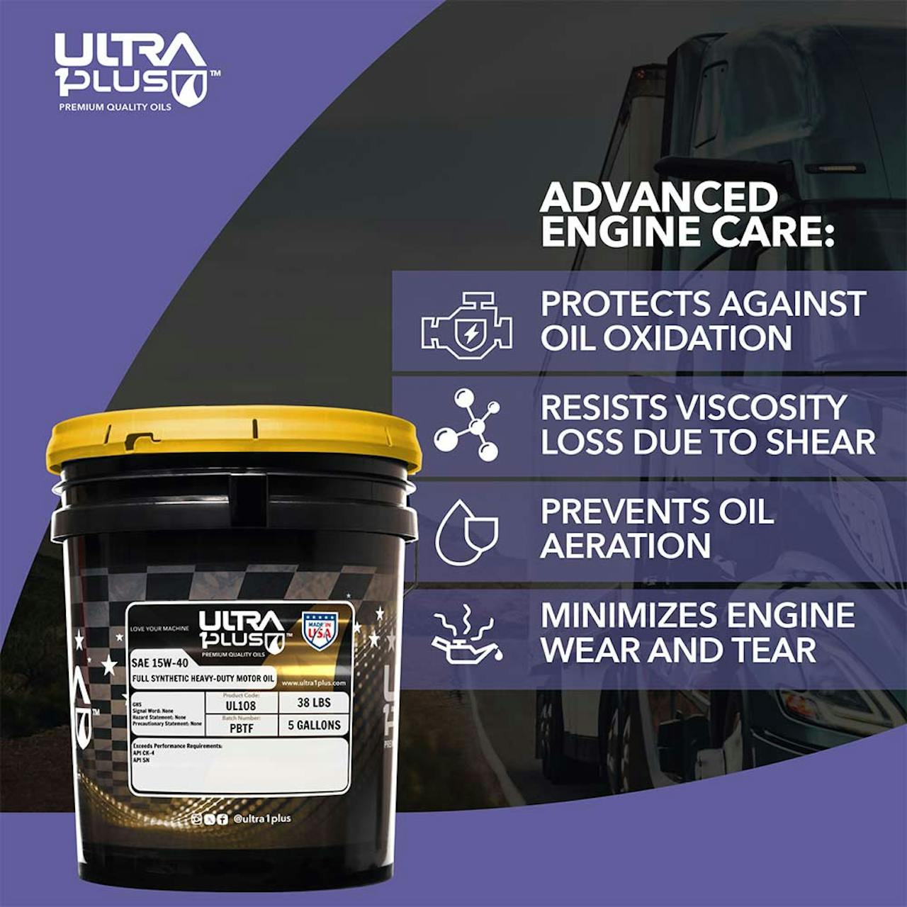 - Ultra1Plus SAE 15W-40 Full Synthetic Heavy-Duty Motor Oil UL108